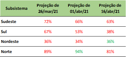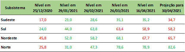 Previsão de níveis de armazenamento para final de abril/2021 (%)