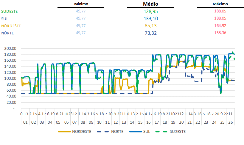 Os preços médios até hoje, 26 de abril. estão em R$/MWh 128,95 para o SE, R$/MWh 133,10 para o Sul, R$/MWh 85,13 para o Nordeste e R$/MWh 73,32 para o Norte do país.