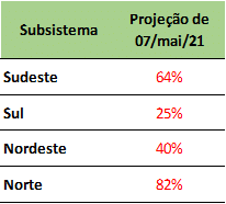 O Operador Nacional do Sistema – ONS divulgou na última sexta-feira (30/abr) projeção de afluências para o mês de maio/21, onde todos os subsistemas devem ter volumes abaixo da Média de Longo Termo – MLT.