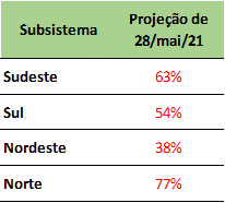 Previsão de níveis de armazenamento para final de maio/2021 (%)