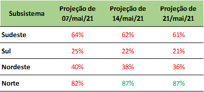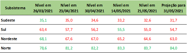 Os níveis de armazenamento caíram mais de 0,5% na última semana, com expectativa de cair 0,9% no Sudeste, 0,3% no Sul e 1,6% no Nordeste até final de maio/21. Apenas os reservatórios do Norte continuam com aumento de níveis.
