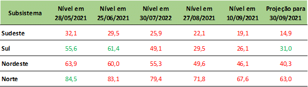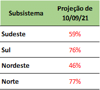 Previsão de níveis de armazenamento para final de setembro/2021 (%)