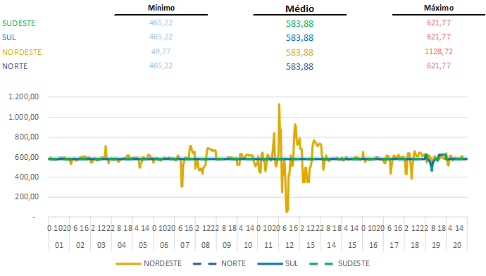 Nas últimas semanas o PLD horário teve maiores flutuações na região Nordeste, o que aconteceu novamente na região Sul neste último domingo (19).
