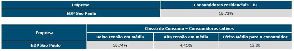 A Agência Nacional de Energia Elétrica – Aneel aprovou o reajuste tarifário da EDP SP, que atende cerca de 2 milhões de unidades em São Paulo, com efeito médio de 12,39% para os consumidores cativos.