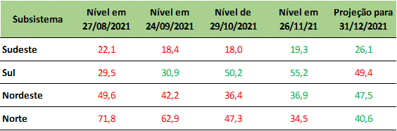 Previsão de níveis de armazenamento para final de novembro/2021 (%)