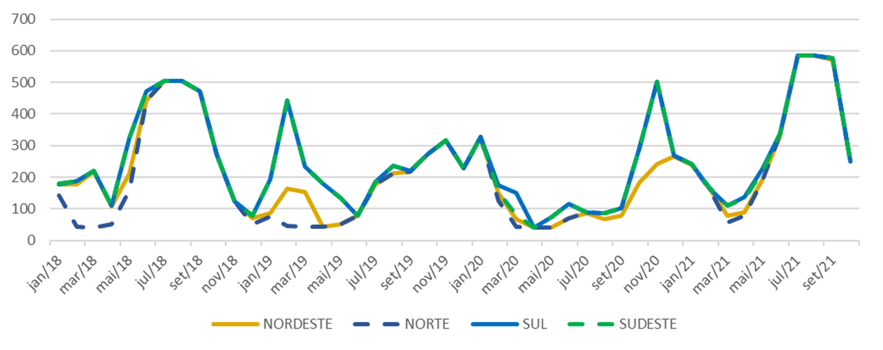 Há cinco semanas os preços não param de cair, saindo do teto regulatório na penúltima semana de setembro/21 (R$/MWh 583,88) e reduzindo mais de 83% até os valores atuais.
