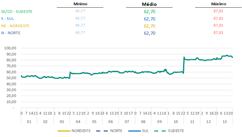 Até o momento, os preços médios para dezembro/21 estão em R$/MWh 62,70 para todos os submercados.