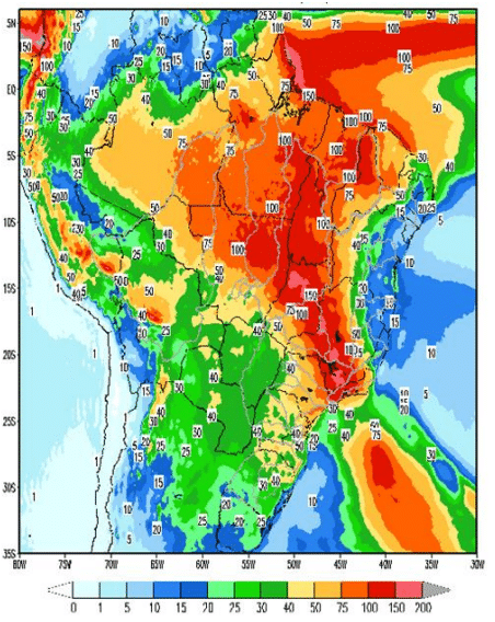 Nesta próxima semana o corredor de umidade atravessa praticamente todo o país, apresentando volumes superiores à 100mm do Norte ao Sudeste.