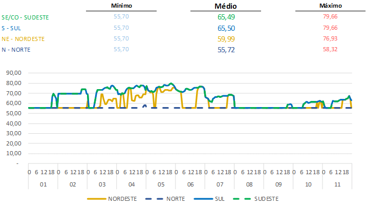 Contudo, durante os dias da semana os preços voltam a subir no Sul e Sudeste do país, ficando mais próximos de R$/MWh 60,00 em média.
