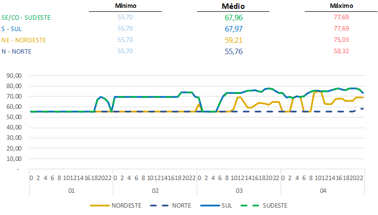 Apesar da FCF indicar PLD no piso regulatório de R$/MWh 55,70 no Nordeste, o que se observa nos dias da semana (03 e 04) é uma pequena elevação em relação ao Norte, mas se mantendo abaixo dos valores do Sul do país.