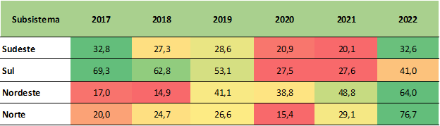 Os subsistemas Norte e Nordeste se destacam pela diferença dos níveis de armazenamento em relação aos anos anteriores, chegando a valores acima de 50%.