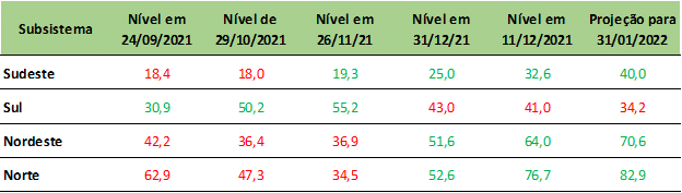 Previsão de níveis de armazenamento para final de janeiro/2022 (%)