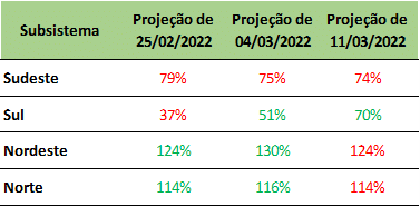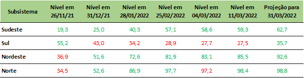 Previsão de níveis de armazenamento para final de março/2022 (%)