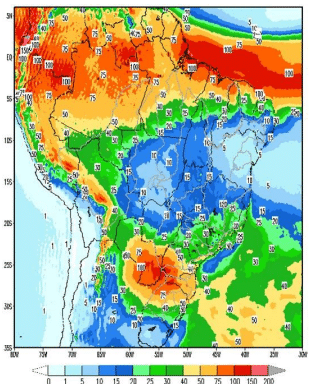 É esperada nova frente fria nas regiões Sul, Sudeste e litoral da Bahia na próxima semana. Deve ocorrer chuva fraca à moderada nas bacias dos rios Jacuí, Uruguai, Iguaçu e incremental à UHE Itaipu. Já no Paranapanema, Tietê e alguns pontos do rio Grande, a precipitação deve ser de forma intensa. Novamente, a expectativa é que a região Norte terá apenas pancadas de chuvas.