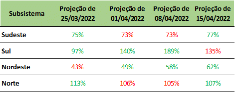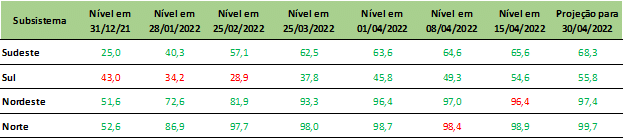Previsão de níveis de armazenamento para final de abril/2022 (%)