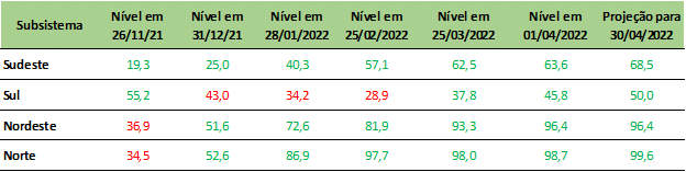 Previsão de níveis de armazenamento para final de abril/2022 (%)