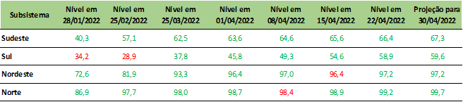 Previsão de níveis de armazenamento para final de abril/2022 (%)