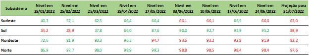 Previsão de níveis de armazenamento para final de julho/2022 (%)