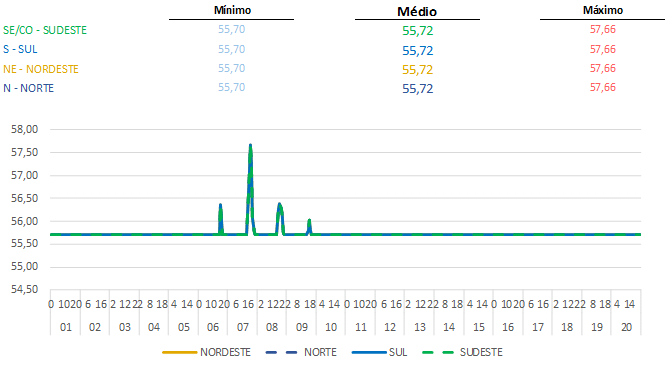A Câmara de Comercialização de Energia Elétrica – CCEE divulgou o Preço de Liquidação das Diferenças – PLD que segue praticamente no piso regulatório (R$55,72/MWh) em todos os submercados. A manutenção desses preços baixos se deve aos bons volumes atingidos pelos reservatórios de todos os subsistemas.