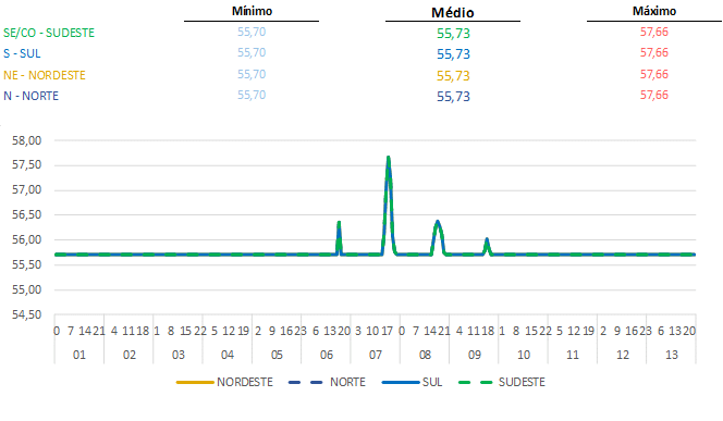 Preço de Liquidação das Diferenças – PLD é divulgado pela Câmara de Comercialização de Energia Elétrica – CCEE e o mesmo se mantém praticamente no piso regulatório (R$55,73/MWh) em todos os submercados.