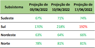 As afluências devem se manter em todas as regiões e apesar da redução na expectativa de chuvas para a região Sul, a mesma ainda segue com bons volumes esperados estando acima da média e atingindo uma projeção de 192%. Os demais subsistemas ficam na faixa de 66% a 81%.