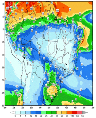 Assim, as precipitações ficarão localizadas nas bacias dos rios Grande e Madeira, Tietê, Jacuí e Uruguai. A instabilidade entre esses dois sistemas também possibilita a ocorrência de chuvas nas bacias dos rios Paranapanema, Iguaçu e na incremental a UHE Itaipu.