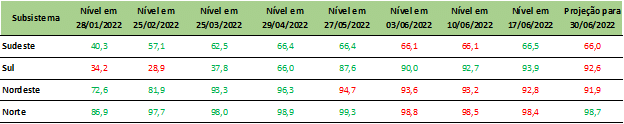 Previsão de níveis de armazenamento para final de junho/2022 (%)