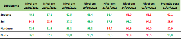 Na última sexta-feira (01), foi divulgado pelo Operador Nacional do Sistema – ONS a revisão semanal o Programa Mensal de Operação – PMO referente ao mês de julho/22. Os subsistemas de forma geral, apresentaram leve queda em seus níveis, mas mesmo assim ainda se mantêm com bons volumes.