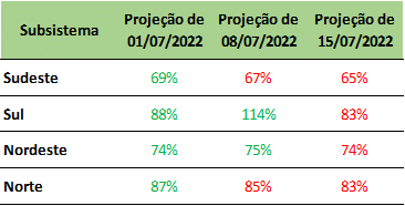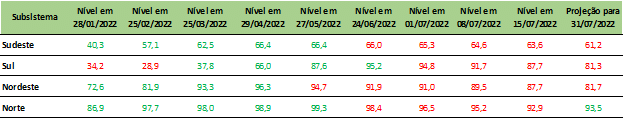 Previsão de níveis de armazenamento para final de julho/2022 (%)