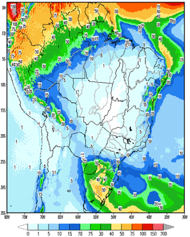 Para essa semana, a previsão é de que o avanço de duas frentes frias nas regiões Sul e Sudeste deve ocasionar chuva fraca tanto em pontos isolados da incremental a UHE Itaipu quanto nas bacias dos rios Uruguai, Jacuí e Iguaçu. Se comparado a semana anterior, espera-se uma diminuição nas precipitações dos subsistemas Norte, Nordeste e Sudeste/Centro-Oeste, enquanto estima-se aumento das afluências para o Sul.