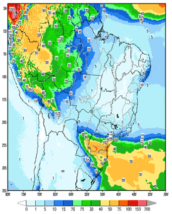 Tanto o avanço de uma frente fria nos estados de Santa Catarina, Paraná e estados da região Sudeste quanto a ocorrência de áreas de instabilidades ocasionam chuva nas bacias dos rios Iguaçu, Uruguai, em alguns pontos do Paranapanema e na incremental a UHE Itaipu. Já nas bacias dos rios Tietê, Jacuí e Madeira também deve ocorrer precipitações, porém de forma mais fraca.