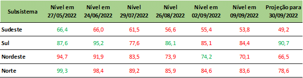 Previsão de níveis de armazenamento para final de setembro/2022 (%)