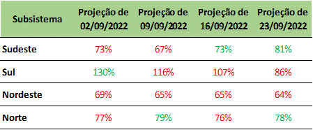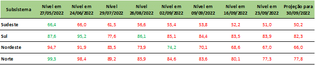 Mesmo com essa previsão, os níveis dos reservatórios do subsistema Sudeste devem chegar no final do mês, aos 50%. Enquanto isso, a região Sul segue como destaque uma vez que deve atingir 82% de sua capacidade de armazenamento.