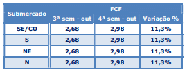 Para a semana em curso (22/10 a 28/10), a Função de Custo Futuro – FCF divulgada na última sexta-feira indica a manutenção desses preços no piso. A variação da FCF pode ser explicada tanto em função da alteração de afluências esperadas quanto na análise dos níveis de armazenamento.