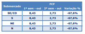 Para a semana em curso (08/out a 14/out), a previsão é que os preços continuem no piso, conforme indicado pela Função de Custo Futuro – FCF divulgada na última sexta-feira (07) pela CCEE. Tal análise é baseada no aumento das previsões de chuvas para esse mês.