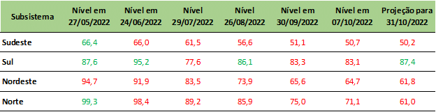 Previsão de níveis de armazenamento para final de outubro/2022 (%)