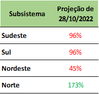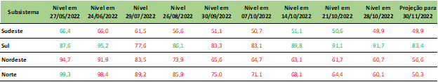 Previsão de níveis de armazenamento para final de novembro/2022 (%)
