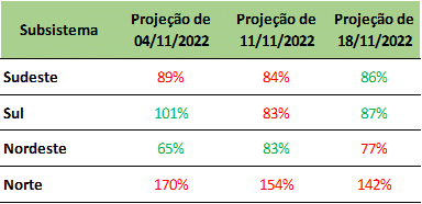 Previsão de níveis de armazenamento para final de novembro/2022 (%)