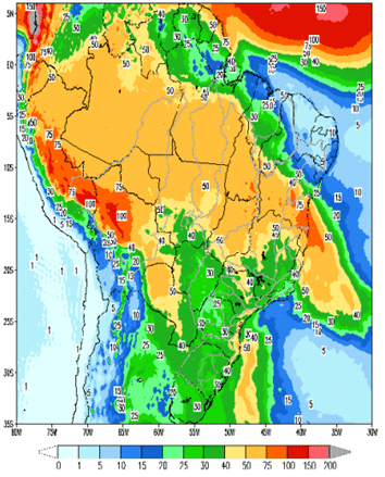 Nessa semana, as precipitações devem se manter no trecho médio da bacia do rio São Francisco e nos trechos médio e baixo do Tocantins e Xingu. Uma frente fria ocasionará chuva fraca na região Sul, mais precisamente nas bacias dos rios Uruguai, Jacuí, Paranapanema, Iguaçu, Tietê, incremental a UHE Itaipu e chuva moderada no rio Madeira. Projeta-se ainda para o final da semana afluências nas regiões Sudeste/Centro-Oeste que devem atingir as bacias dos rios Paranaíba, Grande, alto-médio São Francisco, Xingu e Tocantins.