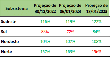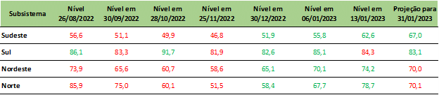 Previsão de níveis de armazenamento para final de janeiro/2023 (%)