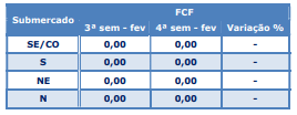 A Função de Custo Futuro – FCF divulgada para essa semana (18/02 a 24/02) se apresenta sem variações projetando preços no piso.