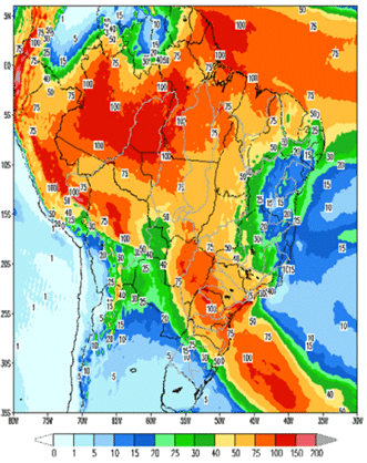 Nessa semana, uma frente fria que avança pelo litoral de São Paulo e sul do Rio de Janeiro acarreta precipitações nas bacias dos rios Paranapanema, Grande, Tietê, Iguaçu, Paraná e na incremental à UHE Itaipu. Na região Sul também ocorrerá chuva devido a um sistema de baixa pressão.