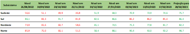 Previsão de níveis de armazenamento para final de fevereiro/2023 (%)