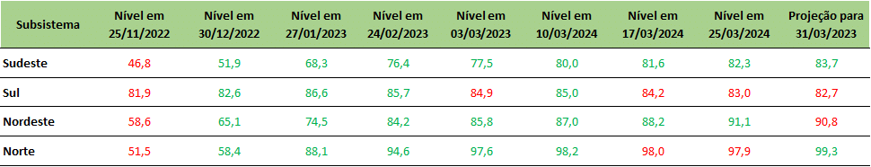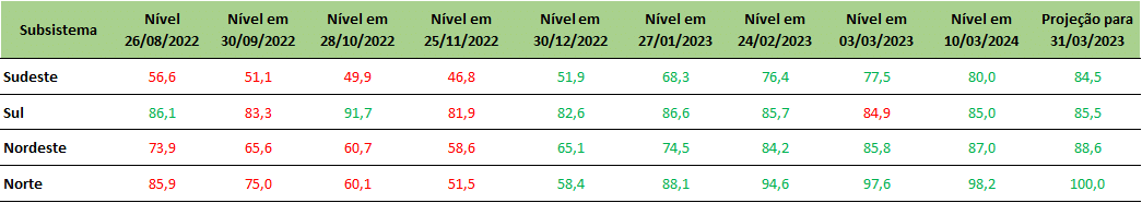 Todos os subsistemas apontam níveis de armazenamento excelentes. Como destaque estão as regiões Norte e Nordeste que mantem os níveis acima de 90%
