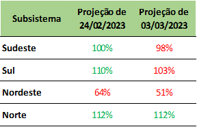 Previsão de níveis de armazenamento para final de março/2023 (%)