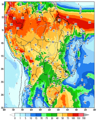 Nessa semana, mais chuva é esperada principalmente nas regiões Norte e Sul, as quais poderão atingir 112% e 103% da Média de Longo Termo – MLT, respectivamente.