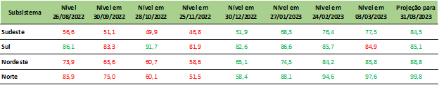 Todos os subsistemas apontam níveis de armazenamento satisfatórios. Como destaque está a região Norte uma vez que apresentou um crescimento de 3% se comparado à semana anterior.