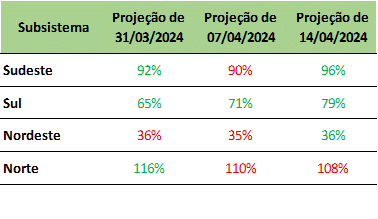 Nessa semana, a previsão é de ascensão nas afluências das regiões Sudeste e Sul se comparado à semana passada. Os volumes poderão chegar a 96% e 79% da Média de Longo Termo – MLT, respectivamente.