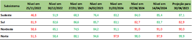Previsão de níveis de armazenamento para final de abril/2023 (%)