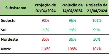 A realização de chuvas volumosas em todas as regiões do país propicia esse cenário. Projeta-se ainda que ao final do mês em curso, todos os subsistemas estejam com capacidade de armazenamento acima de 84%.
